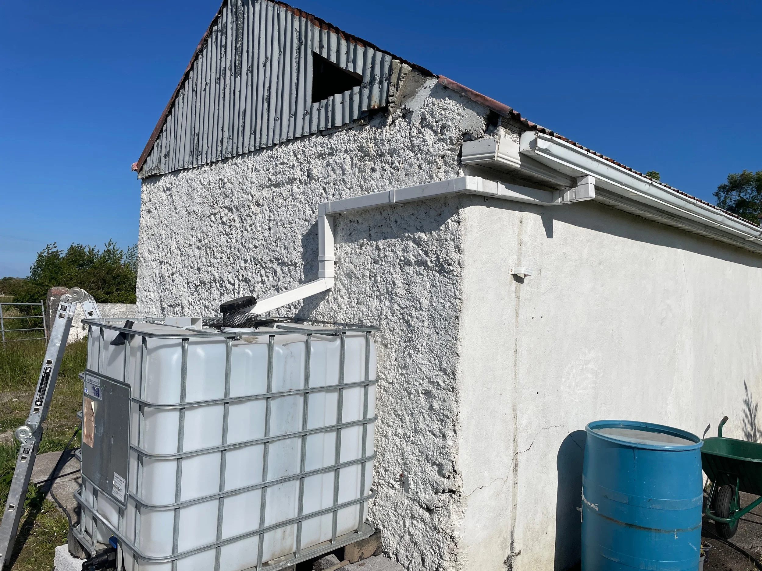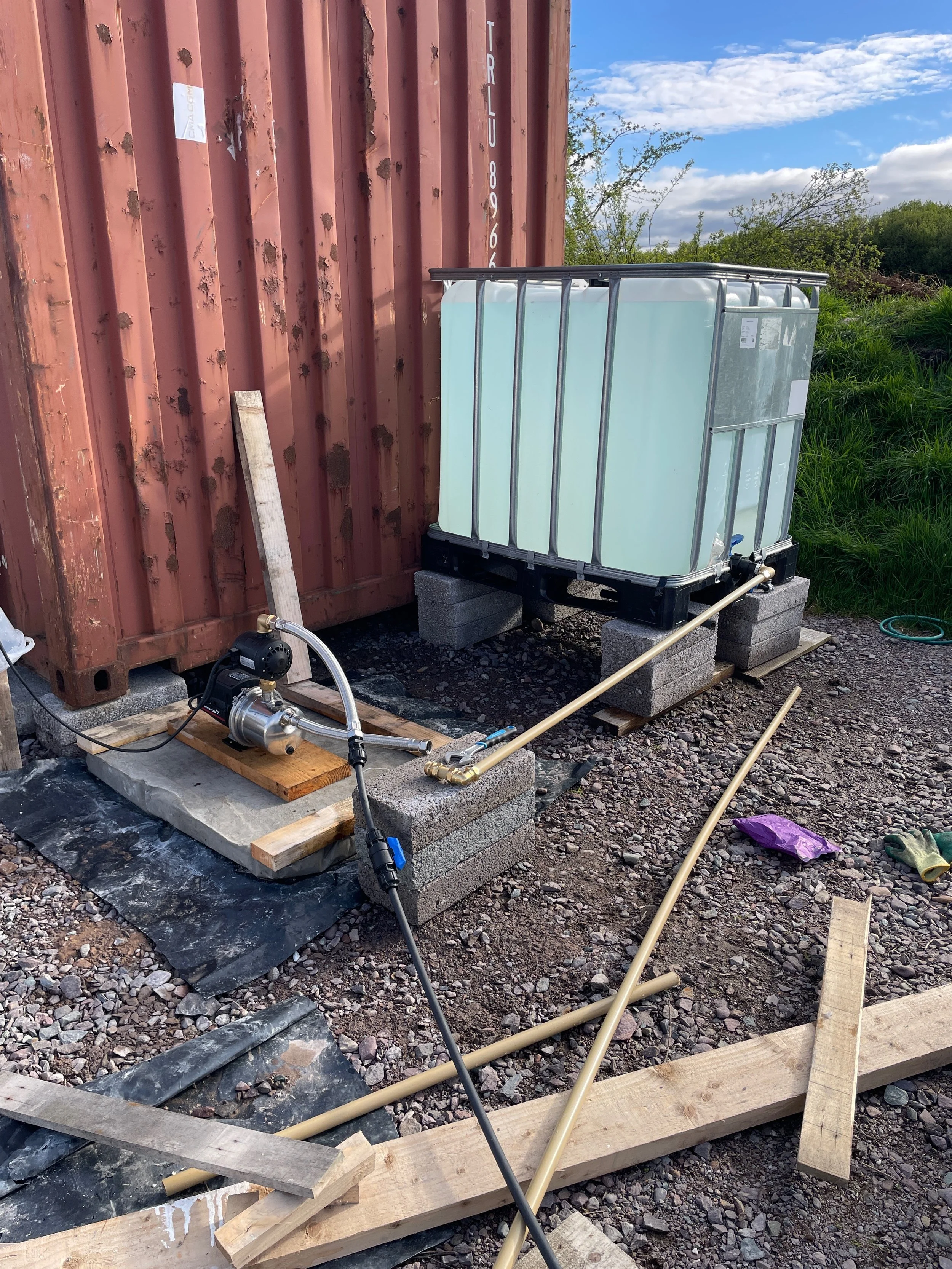 For water collection, we discovered we could collect rainwater from the roof of the cottage into a first 1000 litre IBC (Intermediate Bulk Container) and then gravity-feed it down to our main 2000-liter reservoir. This gravity-fed system works because the cottage is positioned higher than the reservoir IBCs, allowing water to flow naturally without any additional power.