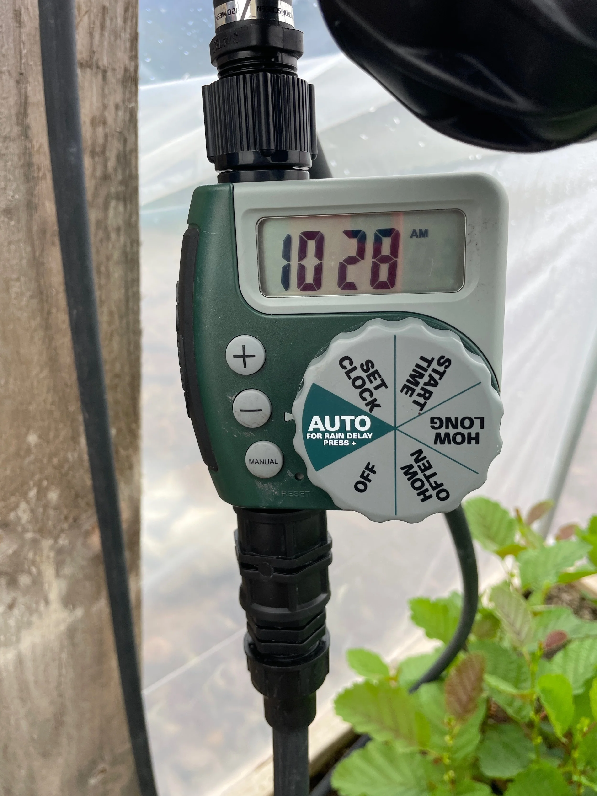 To automate the watering process we installed Orbit timers. These timers are very user-friendly and ensure our plants receive water consistently. We also incorporated simple inline filters to prevent the sprinklers from getting clogged, especially due to algal growth, a common issue with rainwater that lacks chlorine.